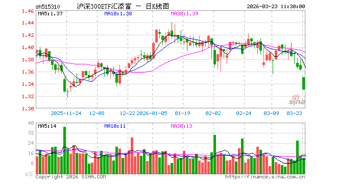 3月23日,规定午间收盘,沪深300ETF汇添富(515310)跌2.42%,报1.330元,成交额1628.03万元。沪深300ETF汇添富(515310)重仓股方面,宁德时间规定午盘跌1.43%,澳门在线赌钱娱乐网入口贵州茅台跌2.52%,中国祯祥跌3.10%,中际旭创跌2.48%,紫金矿业跌2.53%,豪门国际招商银行跌2.21%,新易盛跌3.59%,好意思的集团跌2.81%,兴业银行跌2.29%,长江电力跌0.66%。