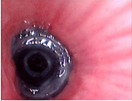 小阳迅速被收治住院,呼吸内科刘雪茹副主任医师为其进行支气管镜探查。跟着镜头逐渐探入,一个玄色圆柱形塑料出当今大夫的视线里,它紧紧地卡在右下叶基底段支气管中,周围遍布黄绿色脓性分泌物,气说念实在扫数堵死。